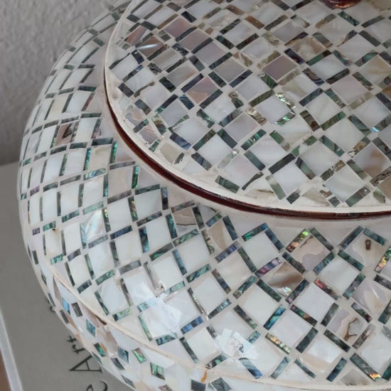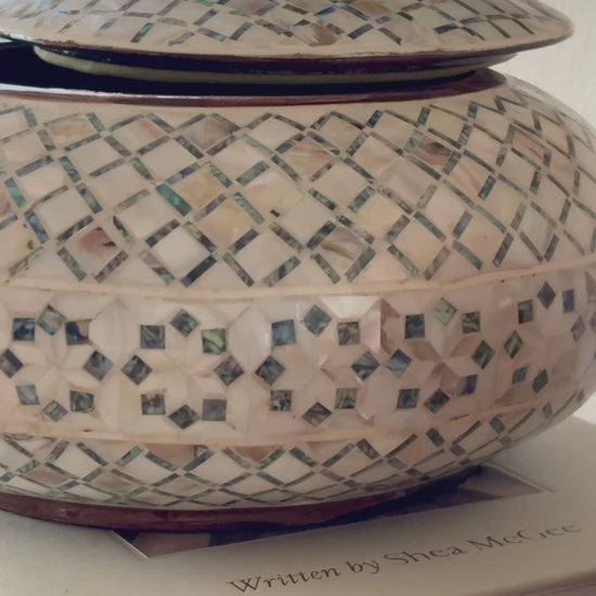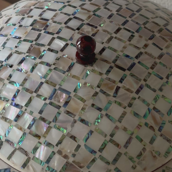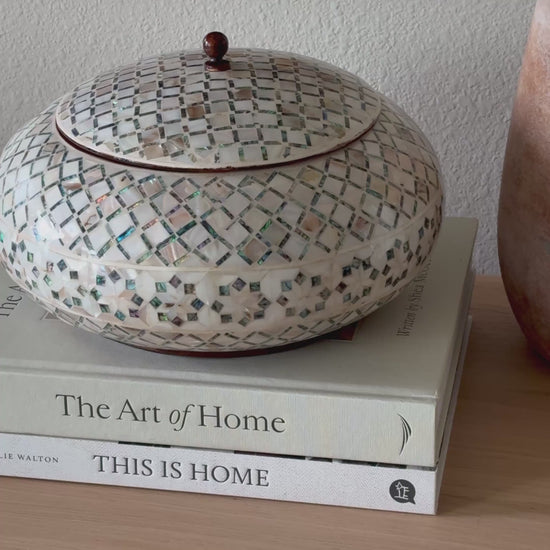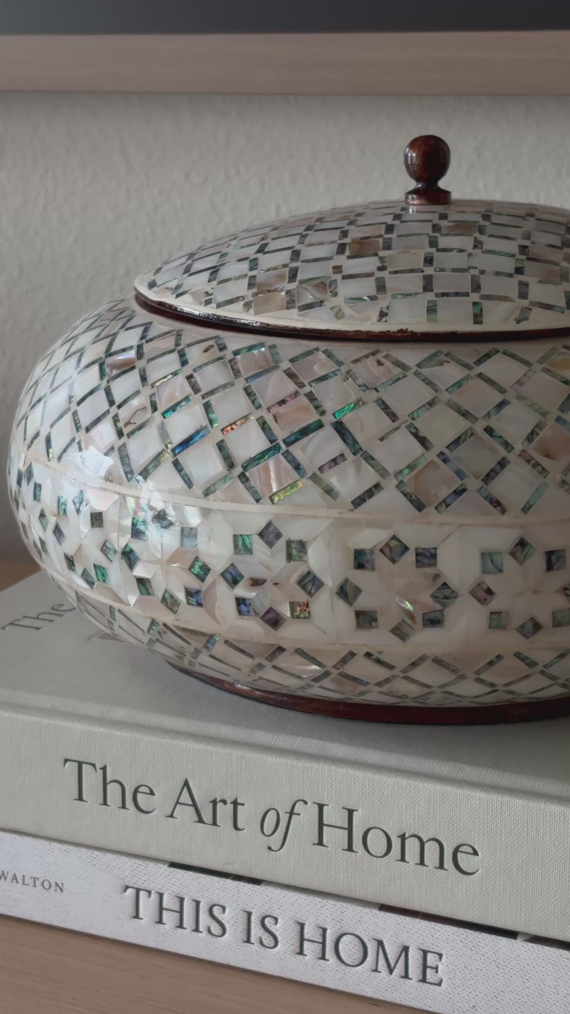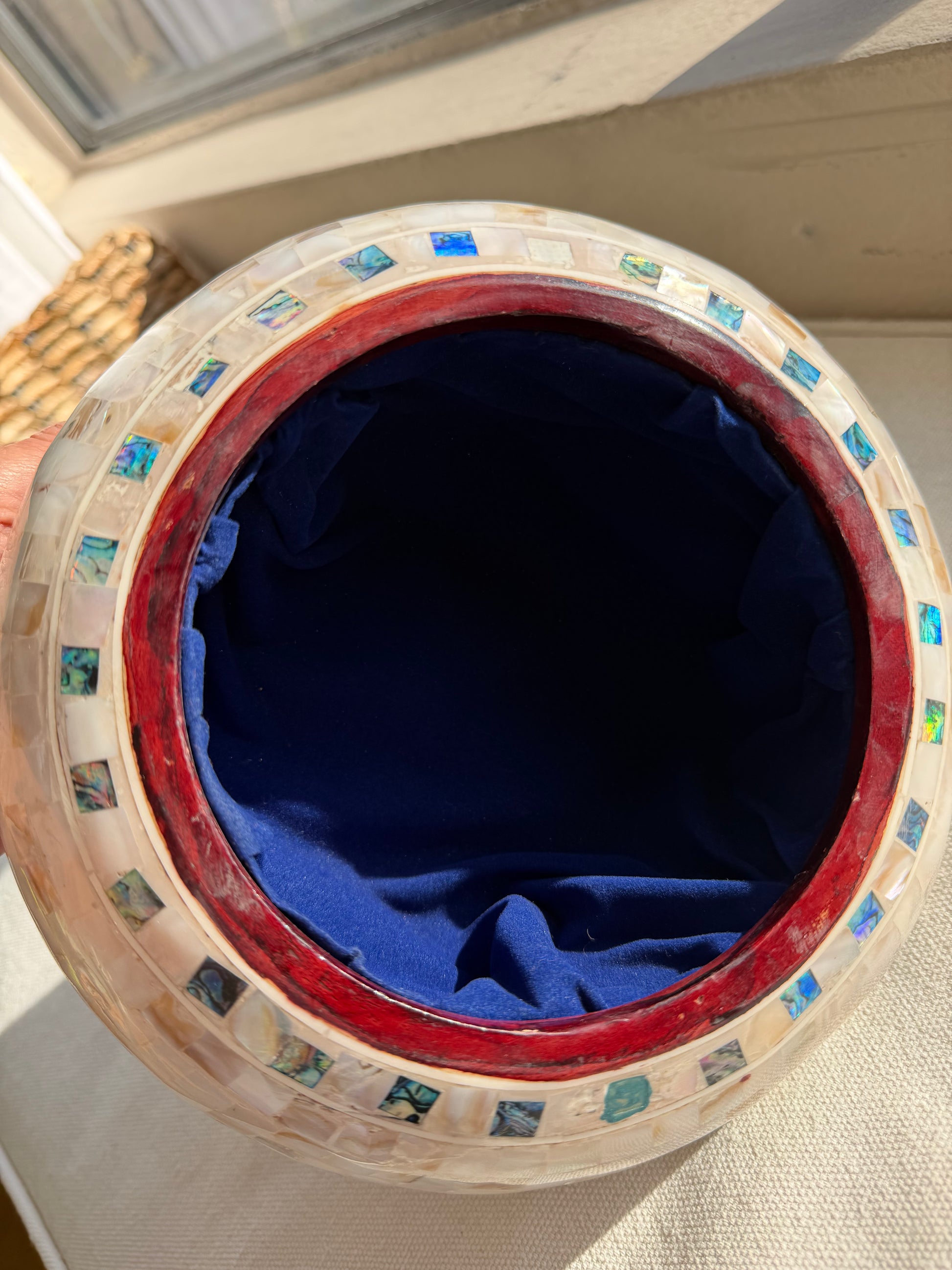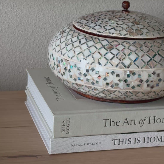 A stunning centerpiece born from centuries-old Mediterranean mosaic artistry, the Lumina Vessel is entirely handcrafted and inlaid with iridescent mother-of-pearl and abalone shell in a geometric diamond pattern. The luminous ivory and teal mosaic exterior catches light from every angle, while a rich navy velvet interior makes it as functional as it is beautiful, perfect for storing jewelry, trinkets, or treasured keepsakes. A wood knob lid and deep red lacquered rim add warmth and finishing elegance. Each piece is one-of-a-kind.