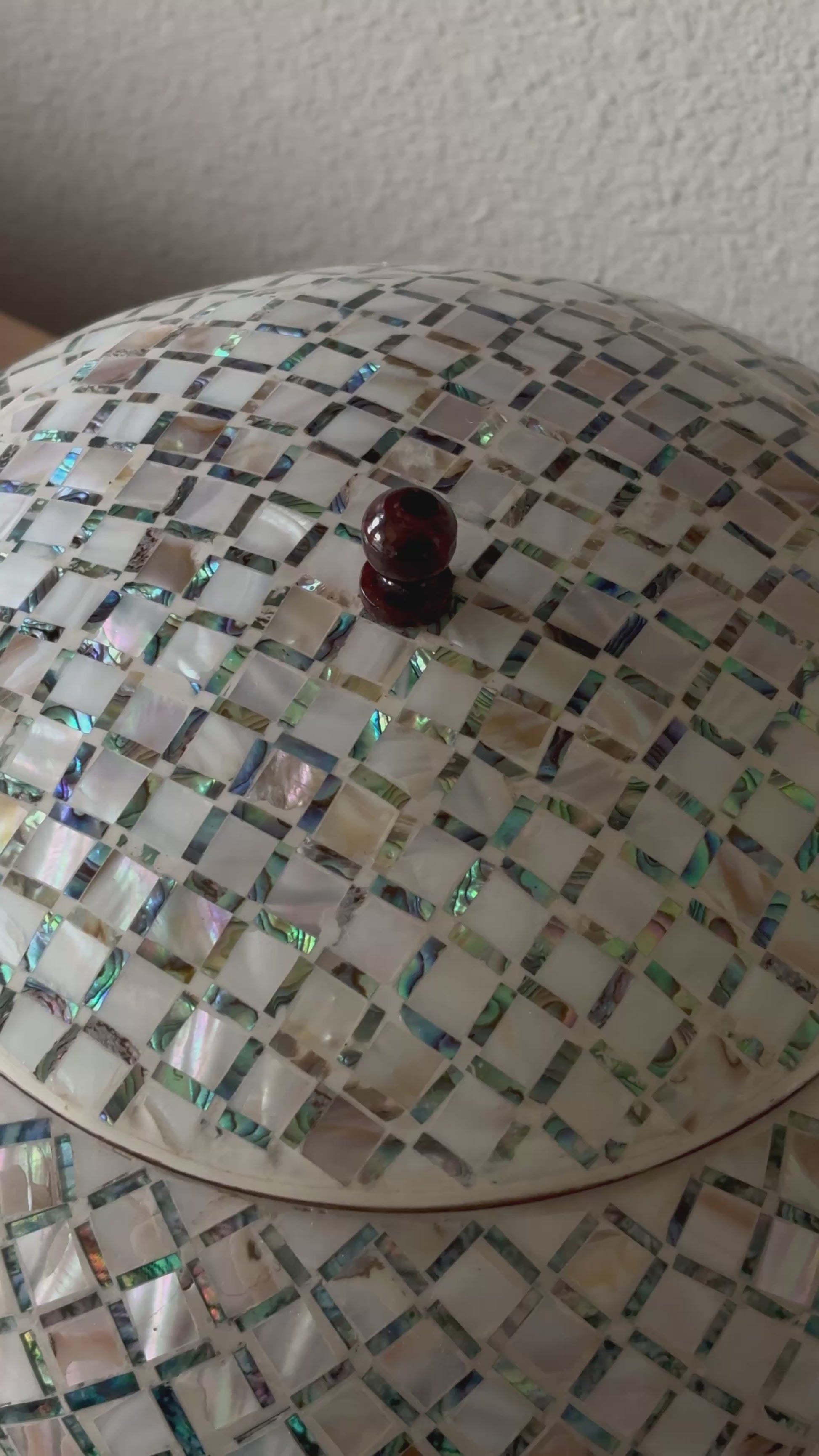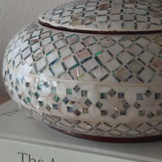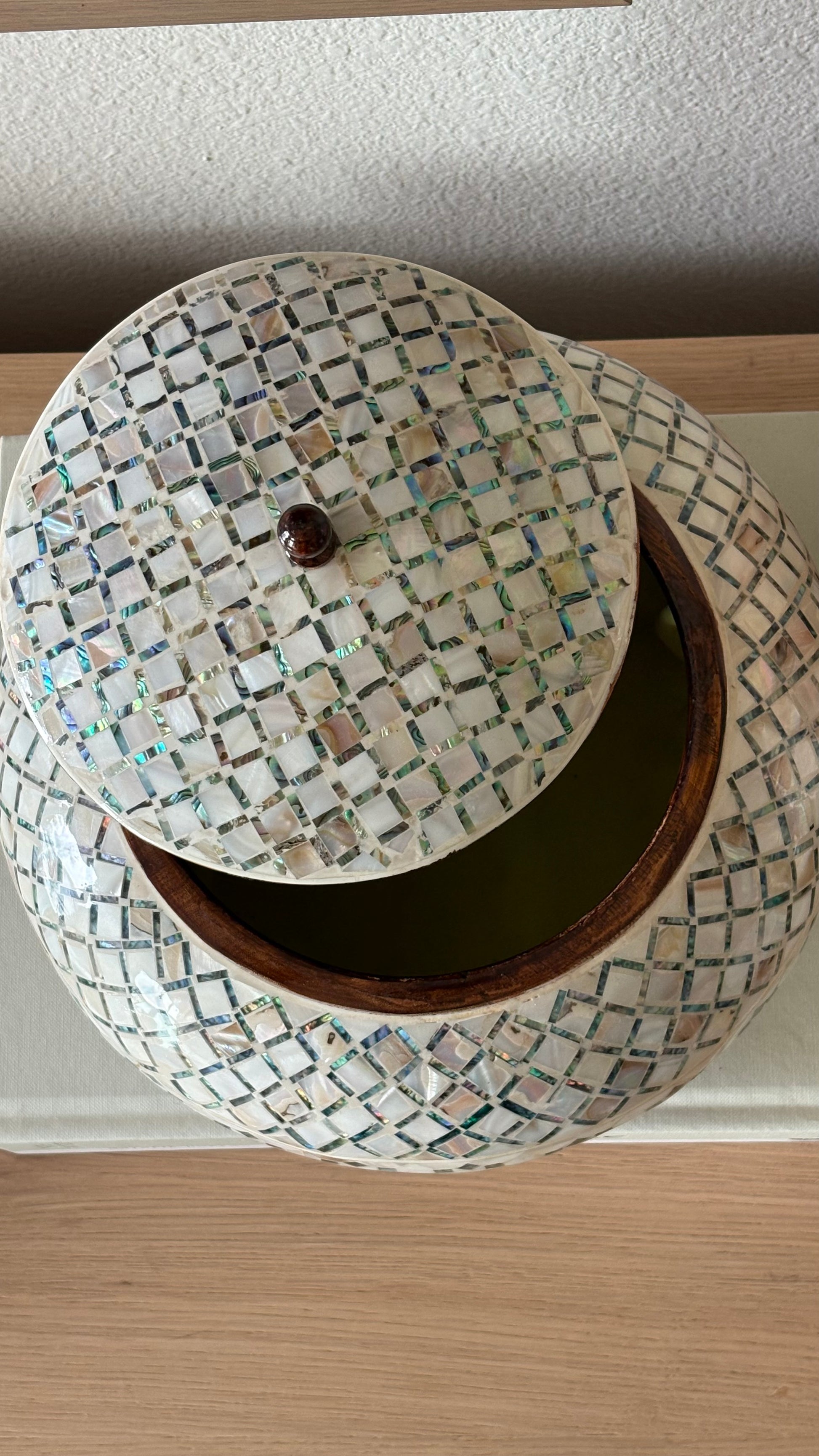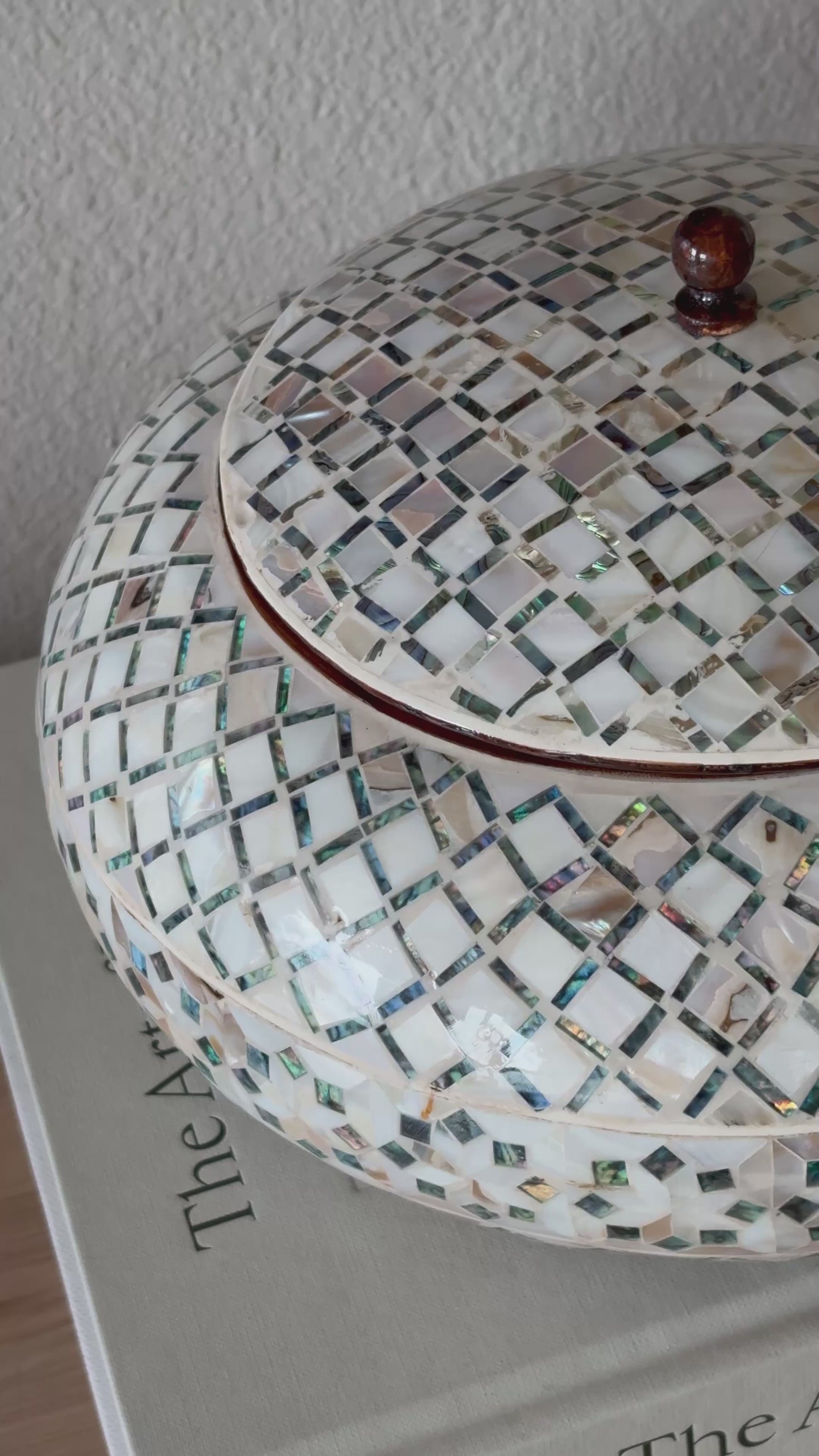 A stunning centerpiece born from centuries-old Mediterranean mosaic artistry, the Lumina Vessel is entirely handcrafted and inlaid with iridescent mother-of-pearl and abalone shell in a geometric diamond pattern. The luminous ivory and teal mosaic exterior catches light from every angle, while a rich navy velvet interior makes it as functional as it is beautiful, perfect for storing jewelry, trinkets, or treasured keepsakes. A wood knob lid and deep red lacquered rim add warmth and finishing elegance. Each piece is one-of-a-kind.