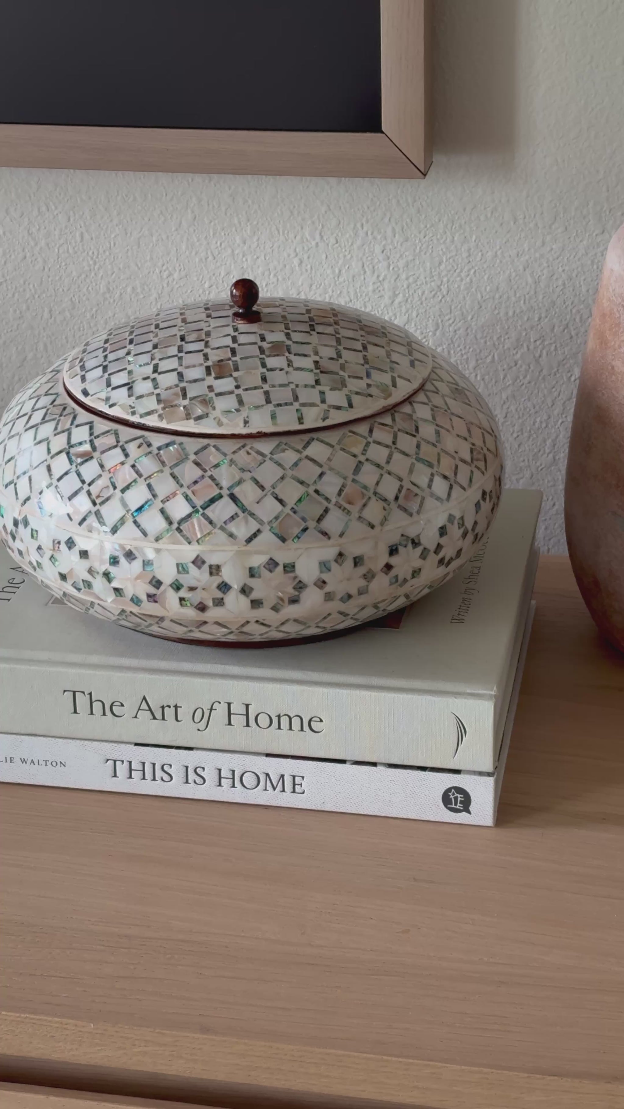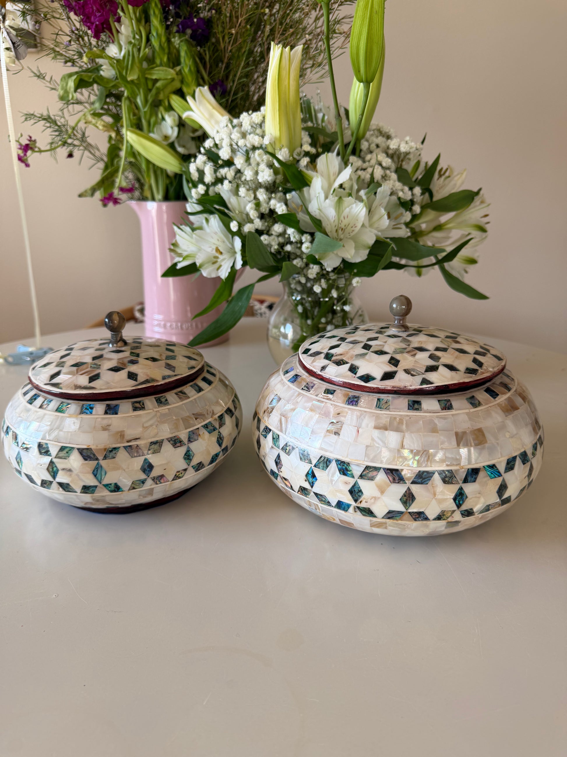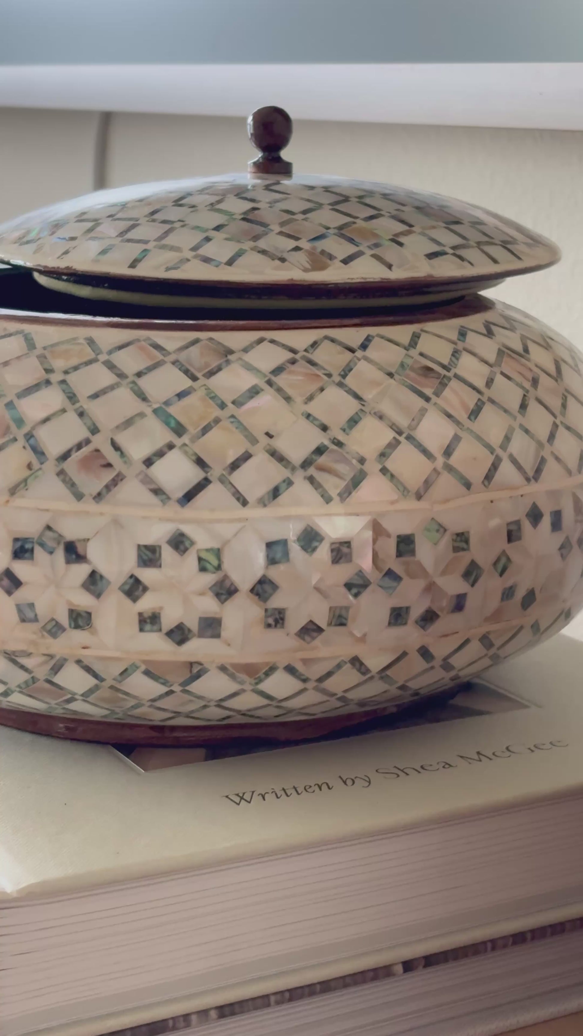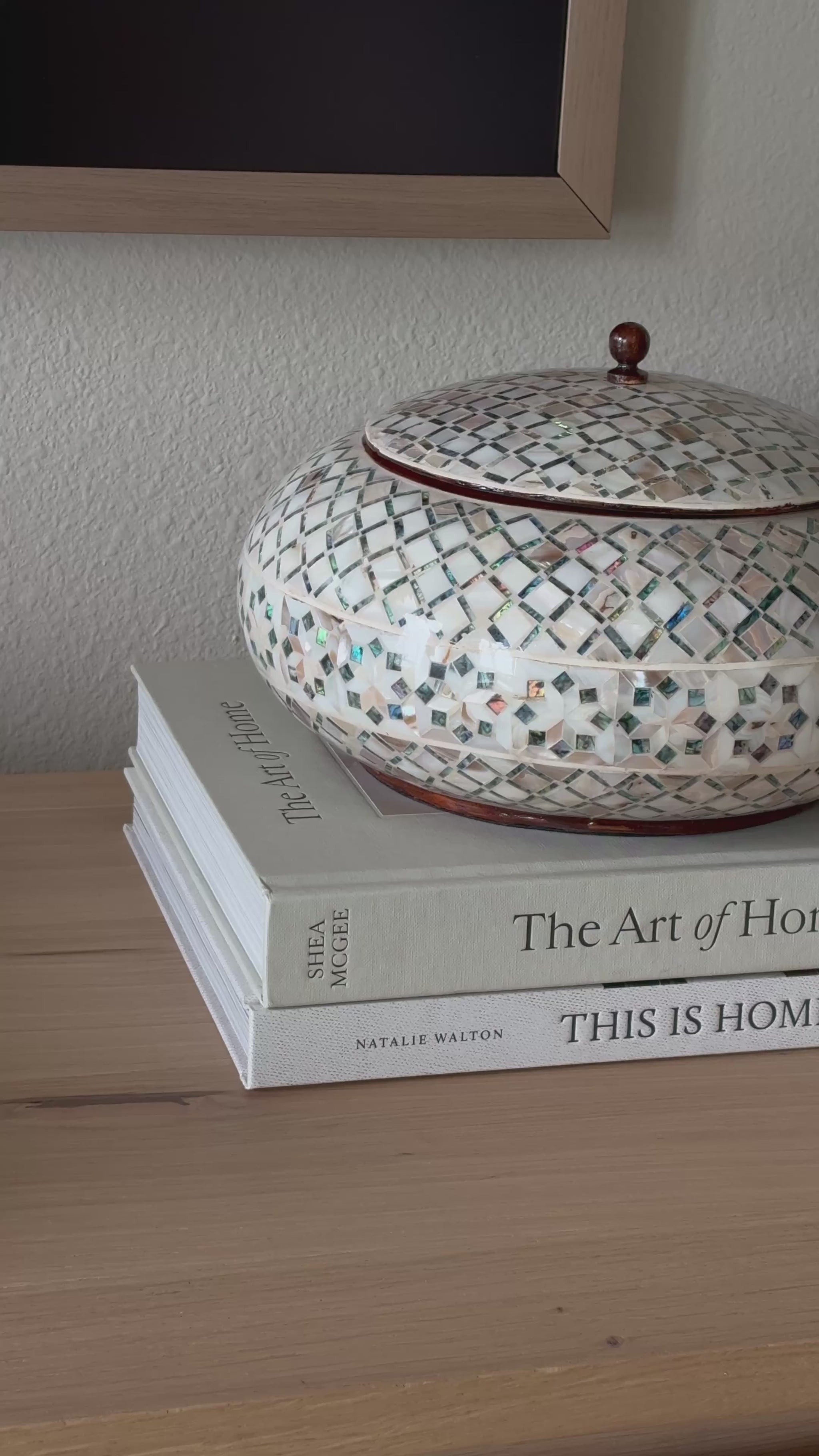 A stunning centerpiece born from centuries-old Mediterranean mosaic artistry, the Lumina Vessel is entirely handcrafted and inlaid with iridescent mother-of-pearl and abalone shell in a geometric diamond pattern. The luminous ivory and teal mosaic exterior catches light from every angle, while a rich navy velvet interior makes it as functional as it is beautiful, perfect for storing jewelry, trinkets, or treasured keepsakes. A wood knob lid and deep red lacquered rim add warmth and finishing elegance. Each piece is one-of-a-kind.