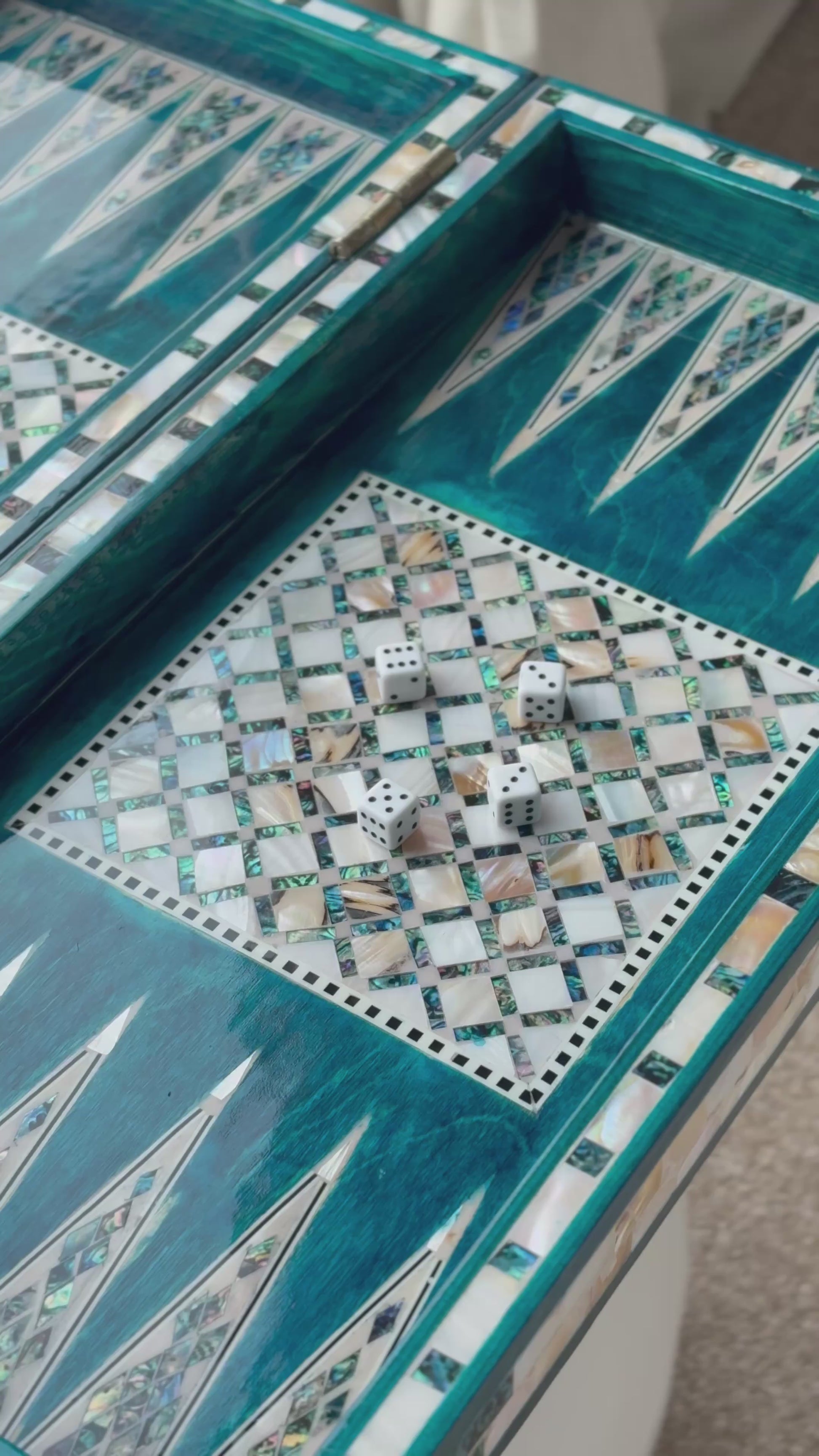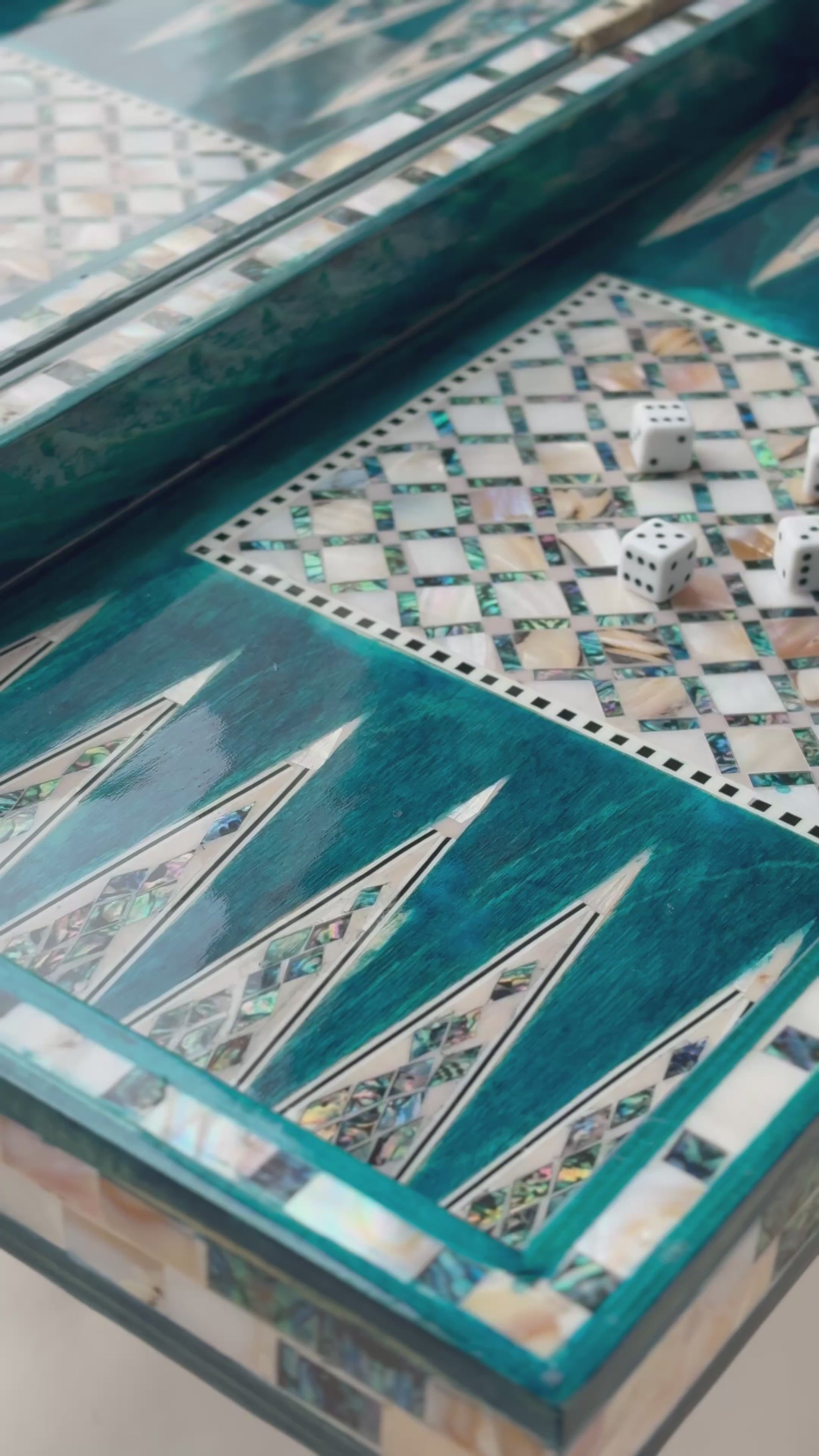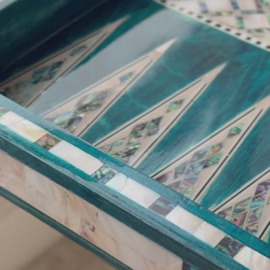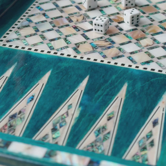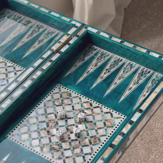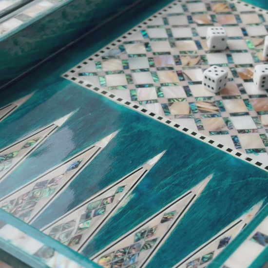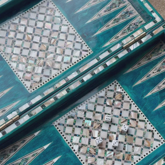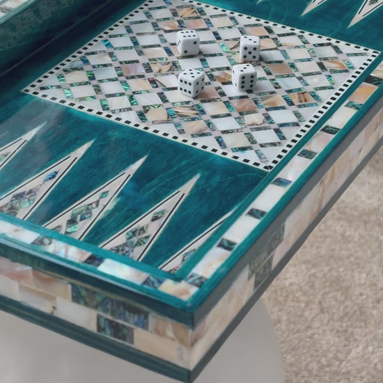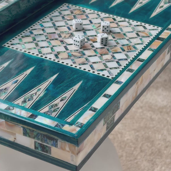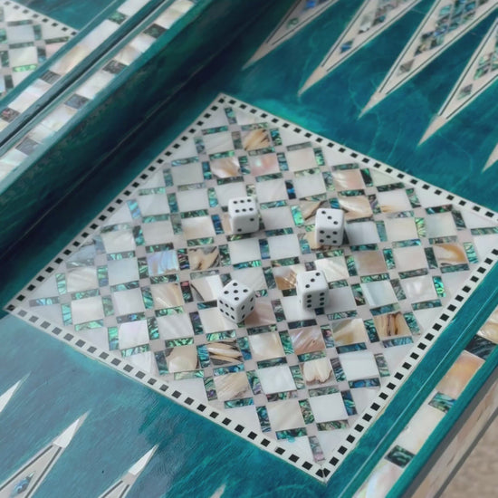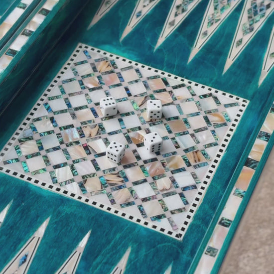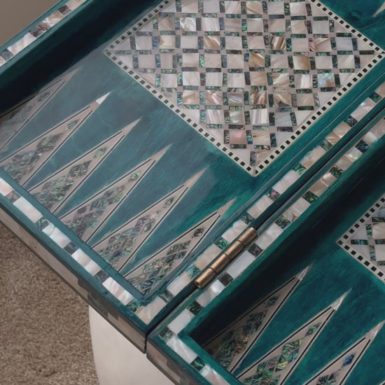 Handmade backgammon and checkers board with vibrant turquoise mother-of-pearl mosaic inlay. Features honeycomb-patterned centerpieces and geometric playing field. Complete with dice. The striking turquoise color evokes Mediterranean seas and coastal elegance - absolutely stunning! This would be a showstopper in any game room, office or living space.