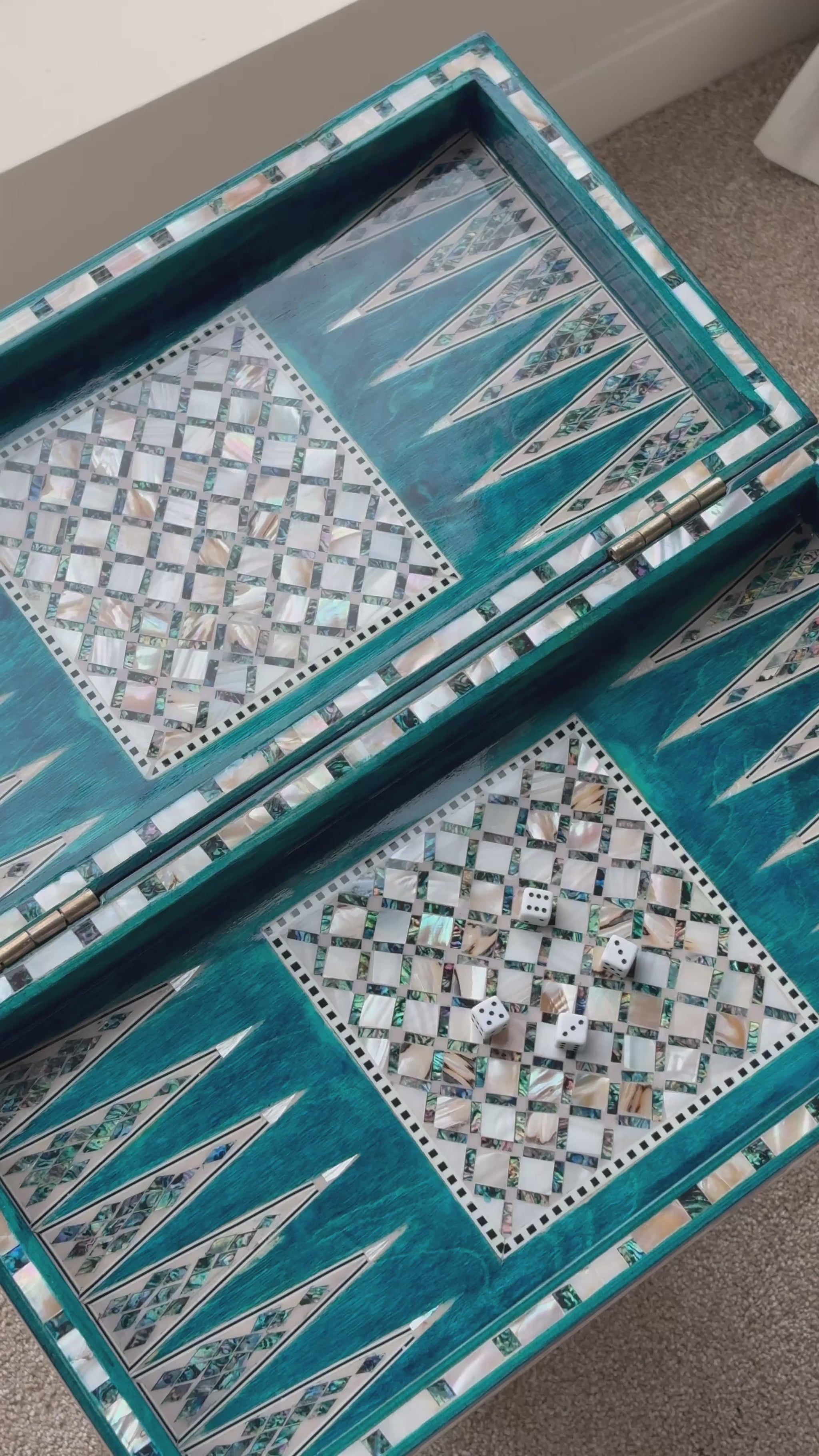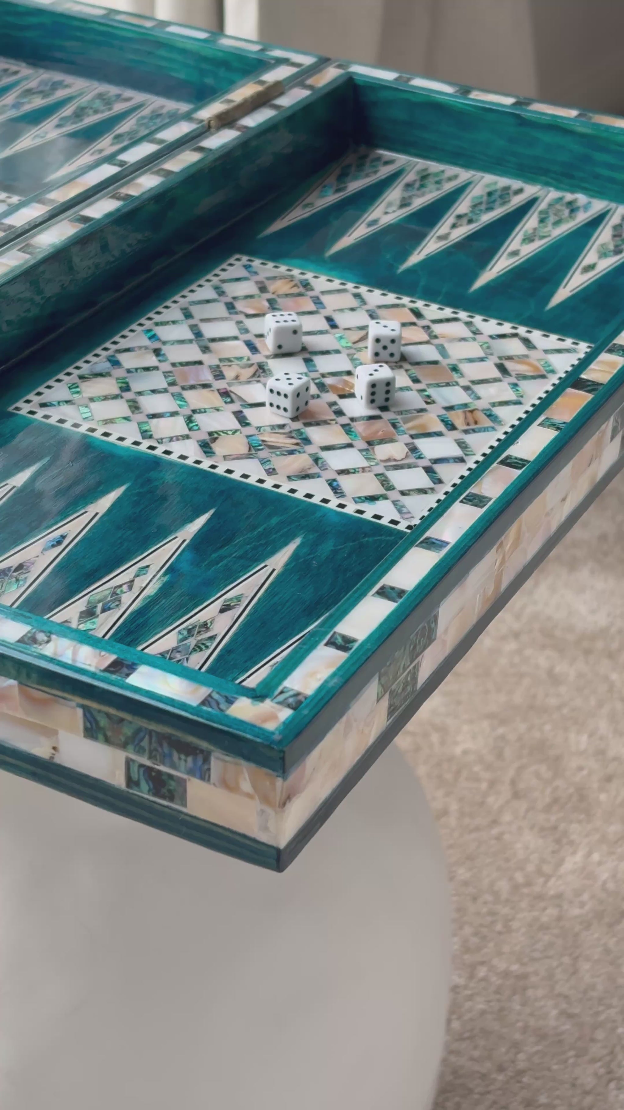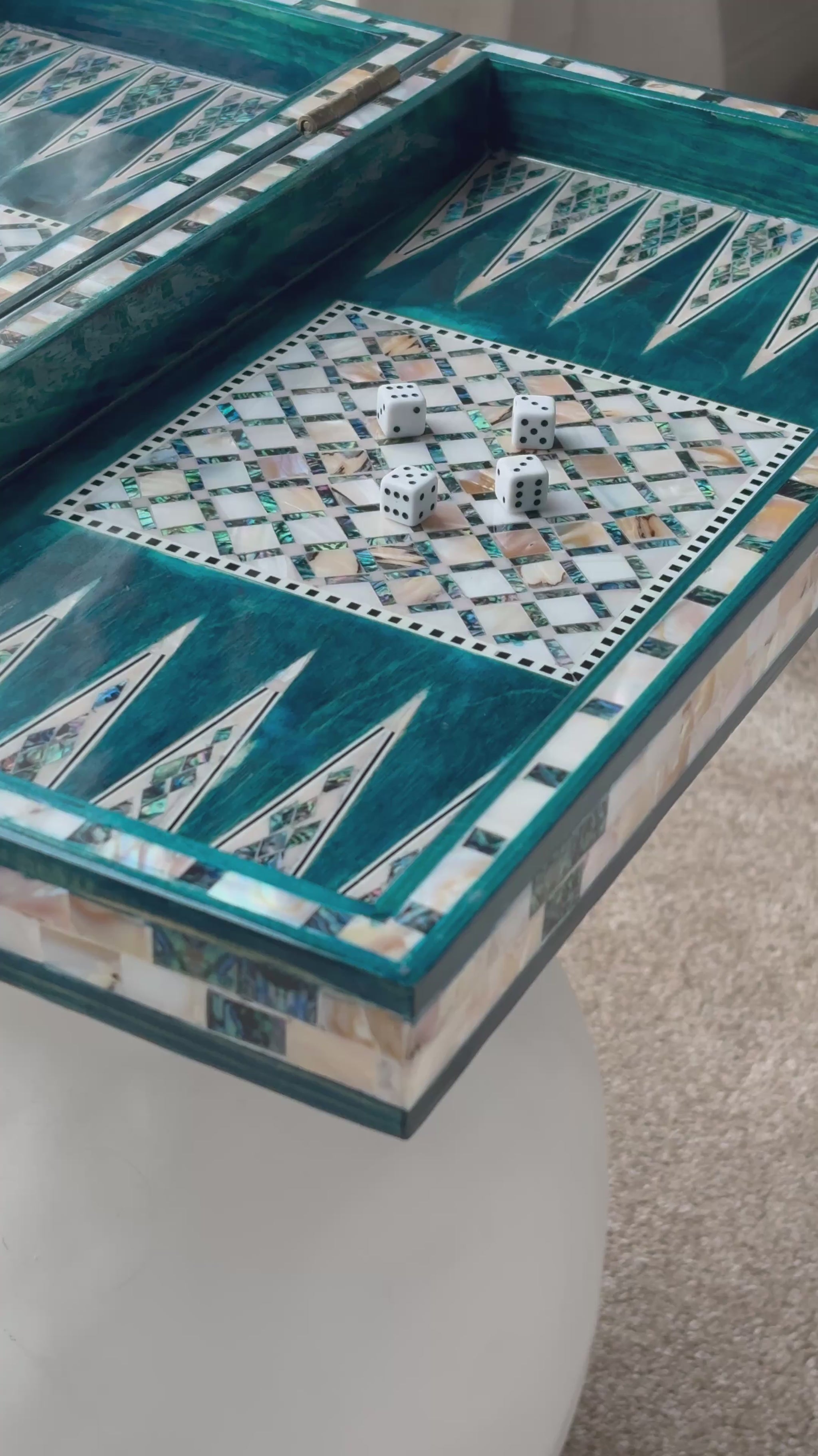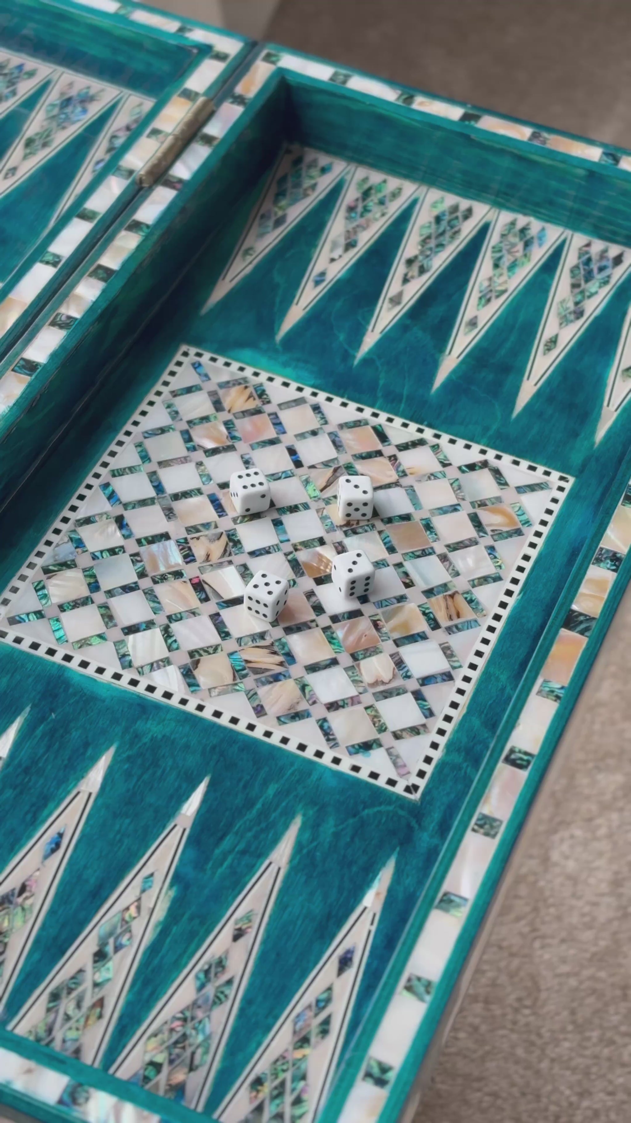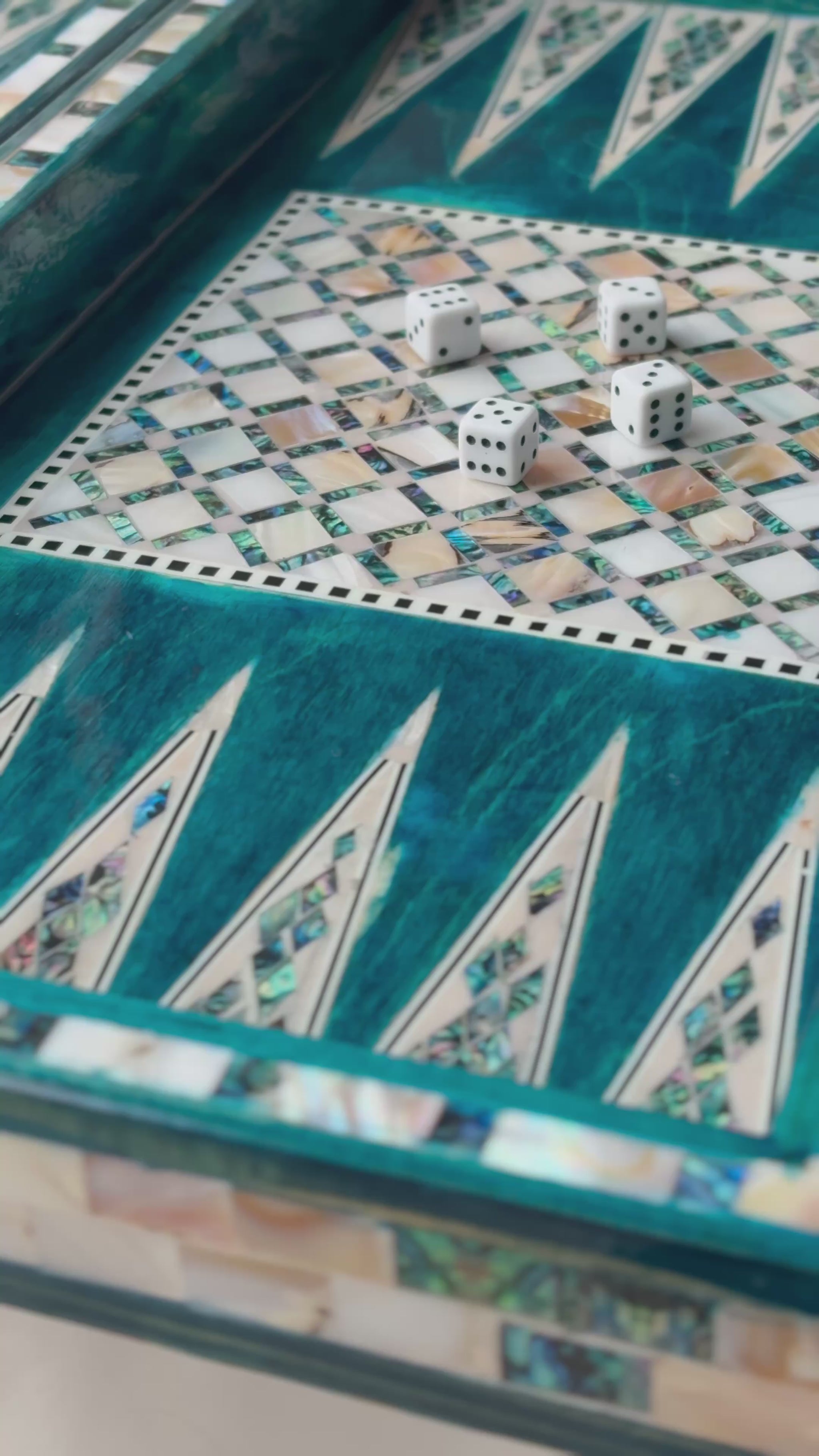 Handmade backgammon and checkers board with vibrant turquoise mother-of-pearl mosaic inlay. Features honeycomb-patterned centerpieces and geometric playing field. Complete with dice. The striking turquoise color evokes Mediterranean seas and coastal elegance - absolutely stunning! This would be a showstopper in any game room, office or living space.