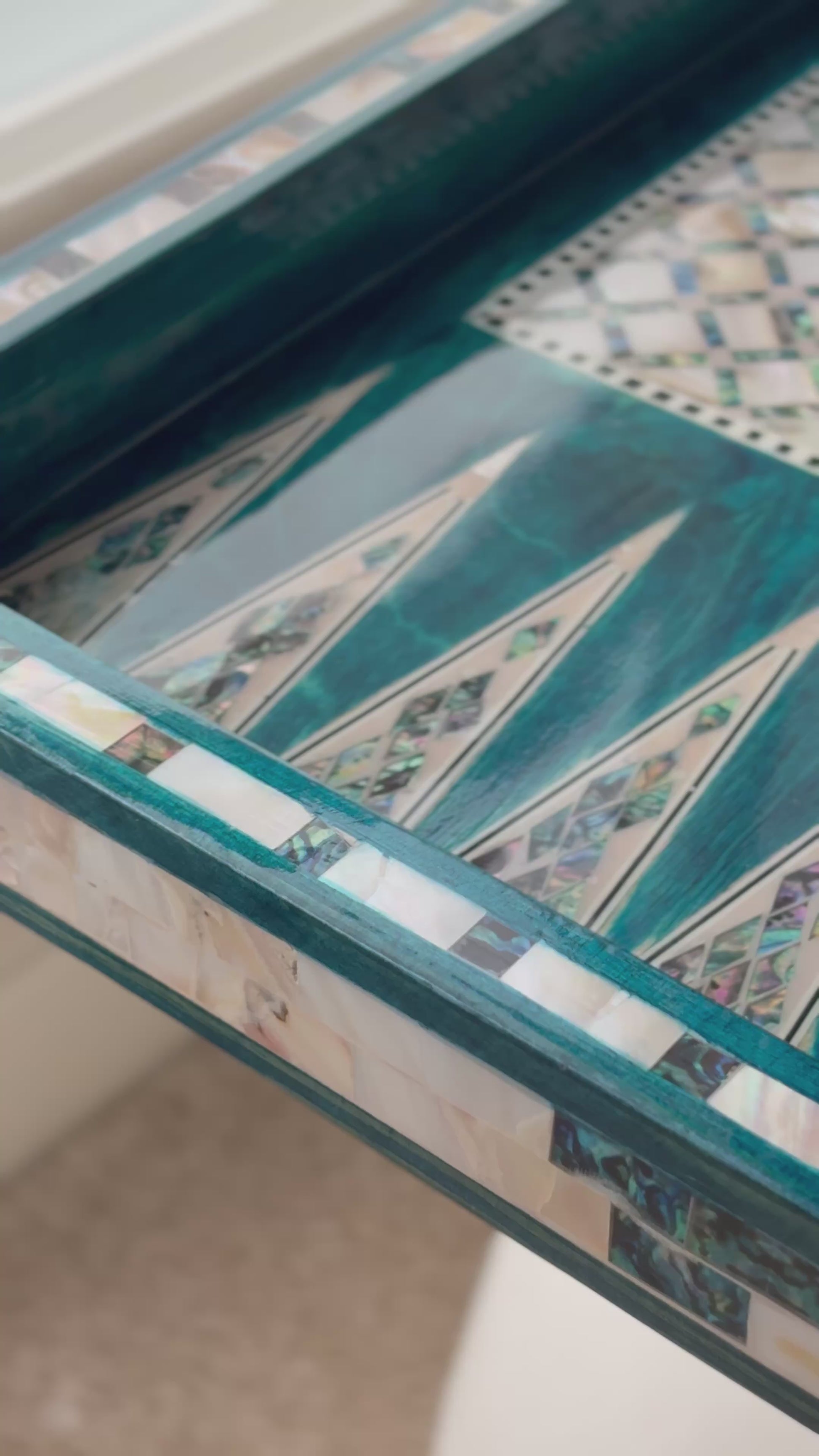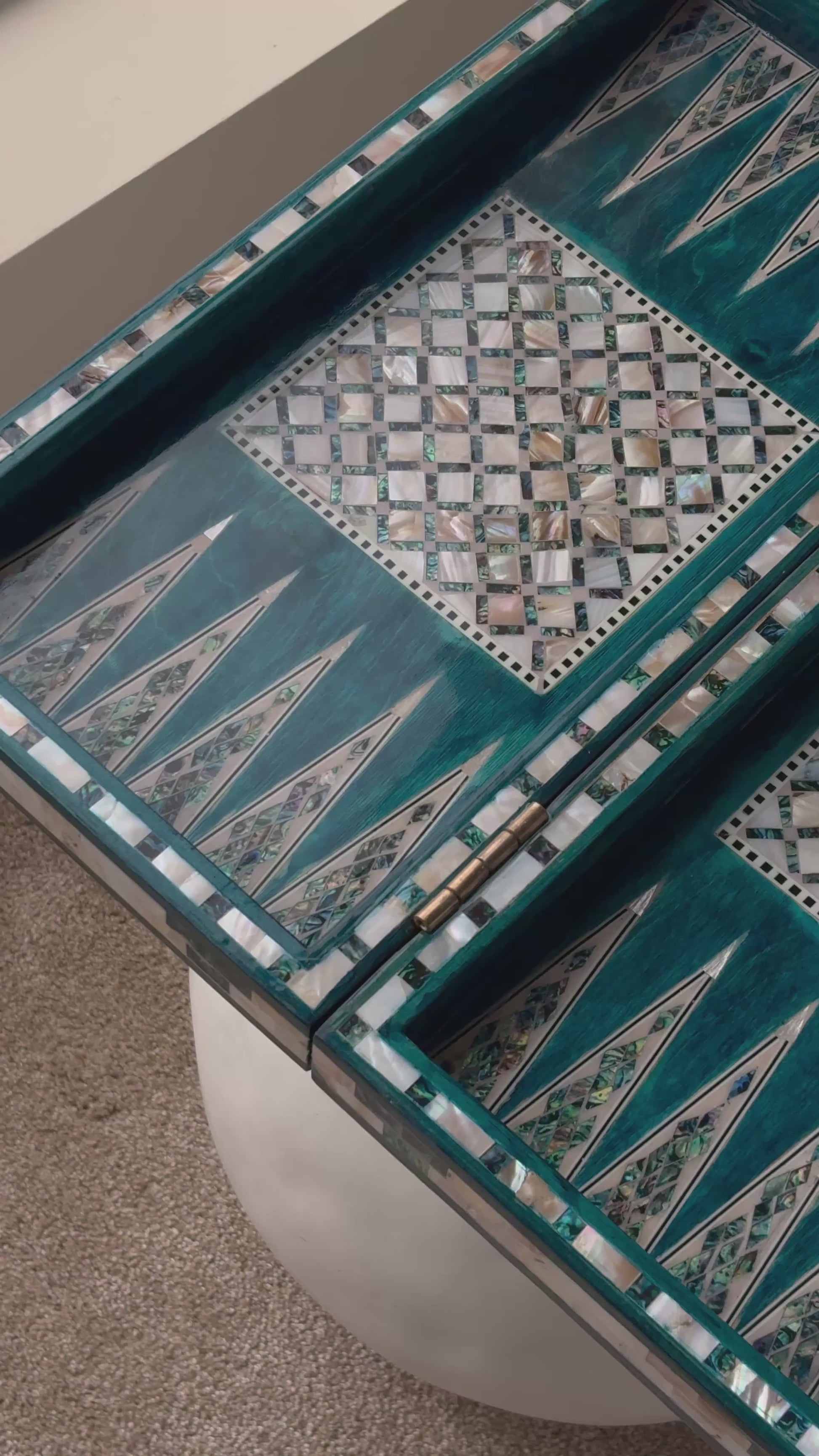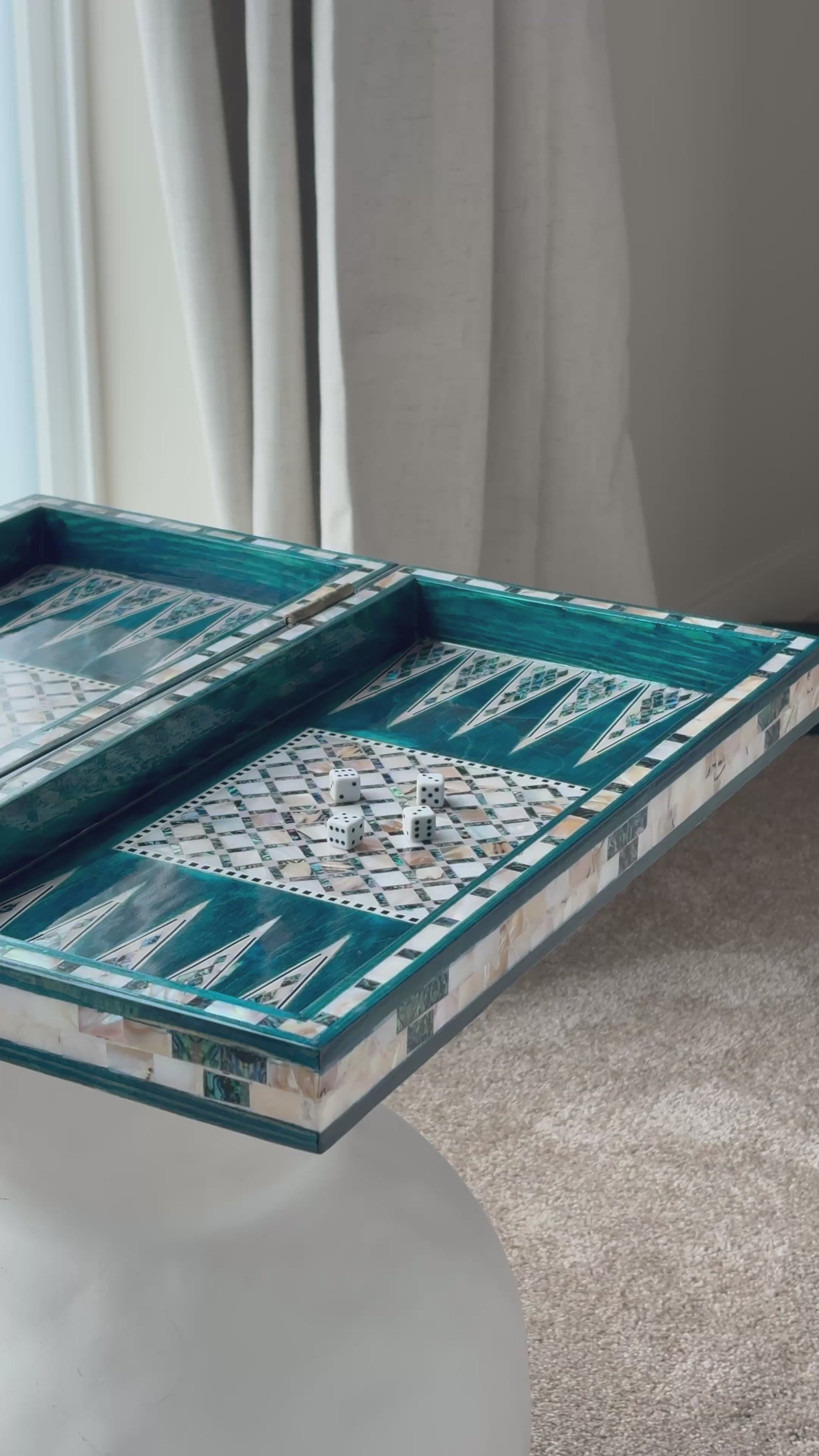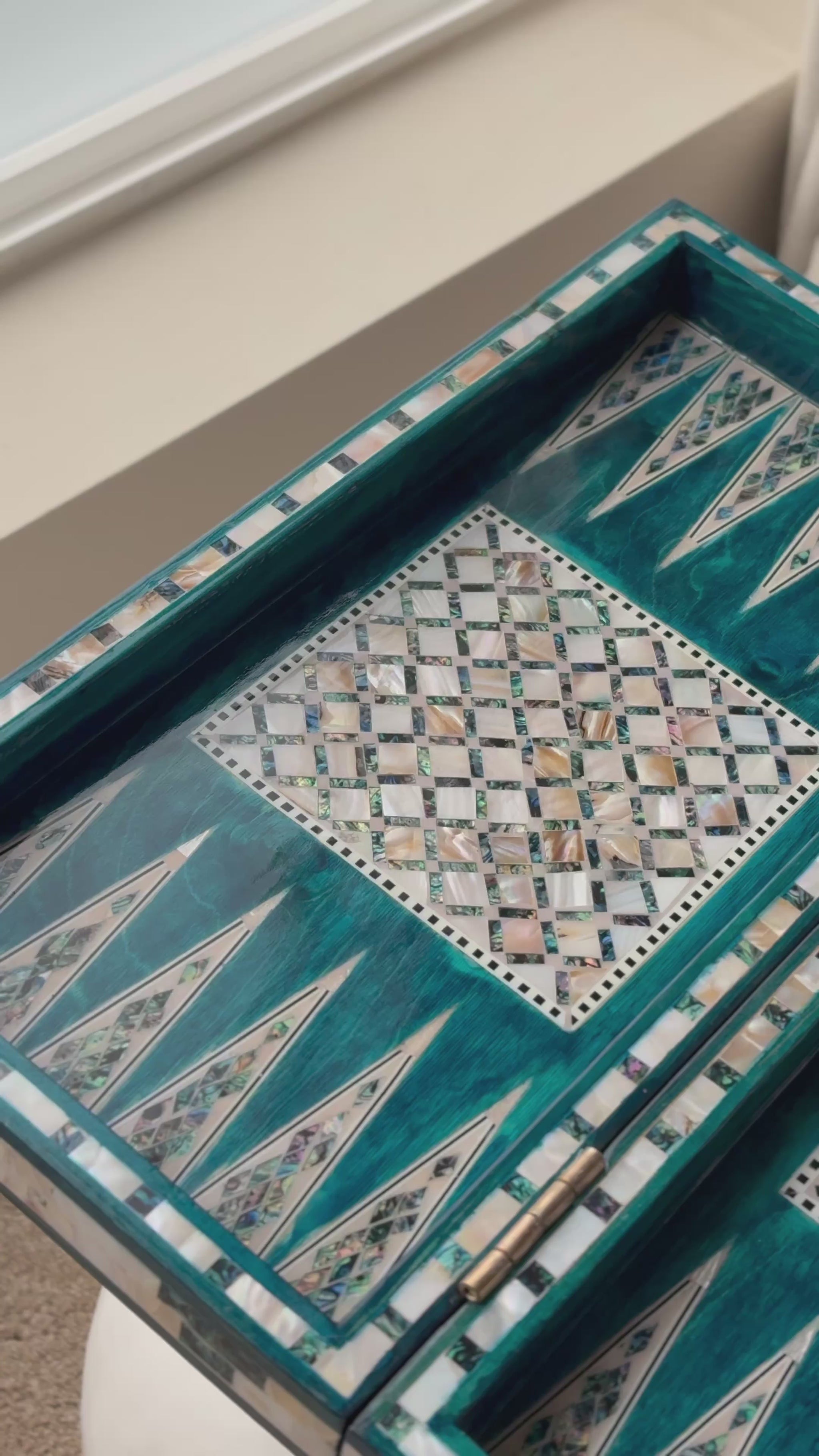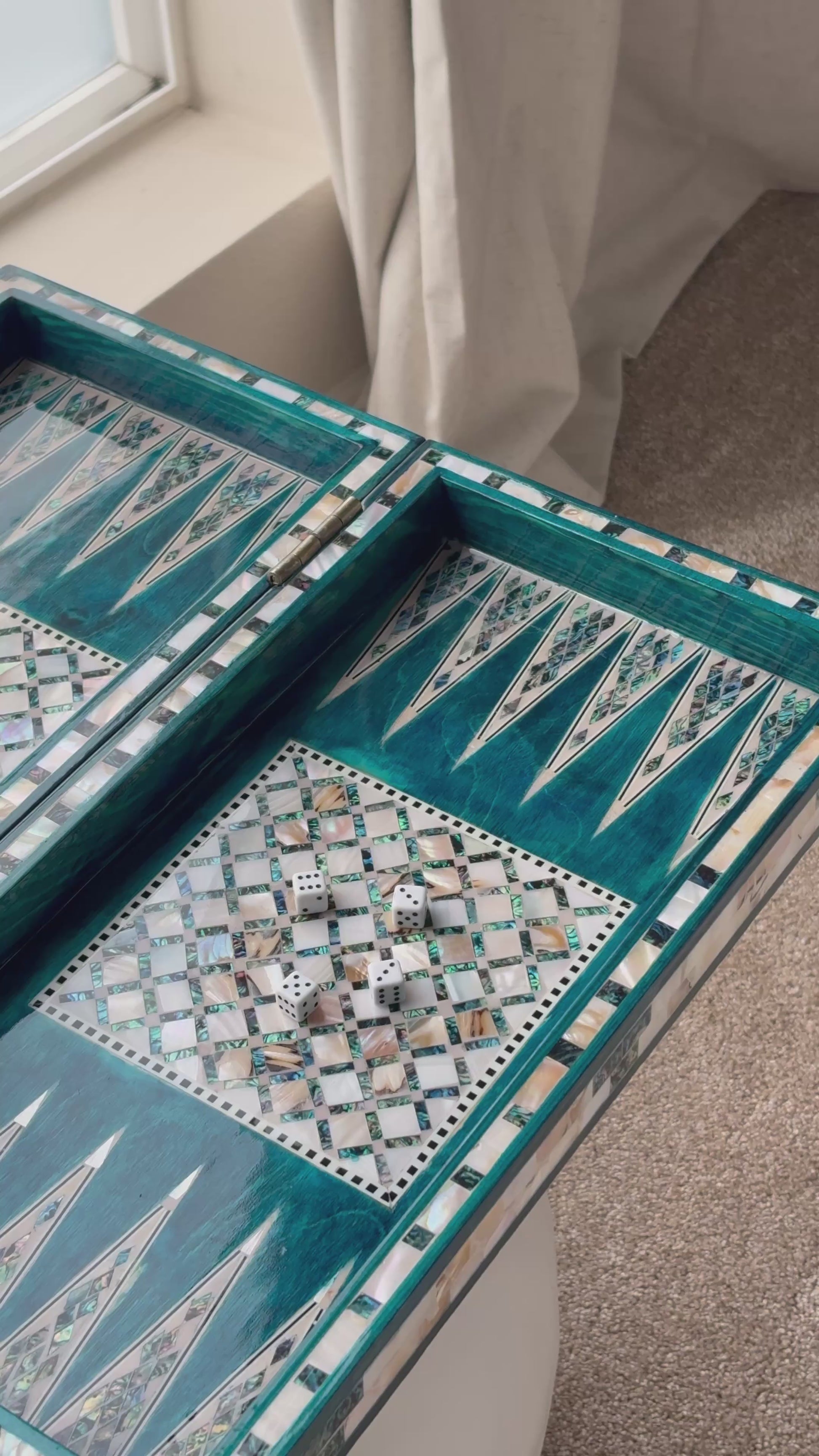 Handmade backgammon and checkers board with vibrant turquoise mother-of-pearl mosaic inlay. Features honeycomb-patterned centerpieces and geometric playing field. Complete with dice. The striking turquoise color evokes Mediterranean seas and coastal elegance - absolutely stunning! This would be a showstopper in any game room, office or living space.