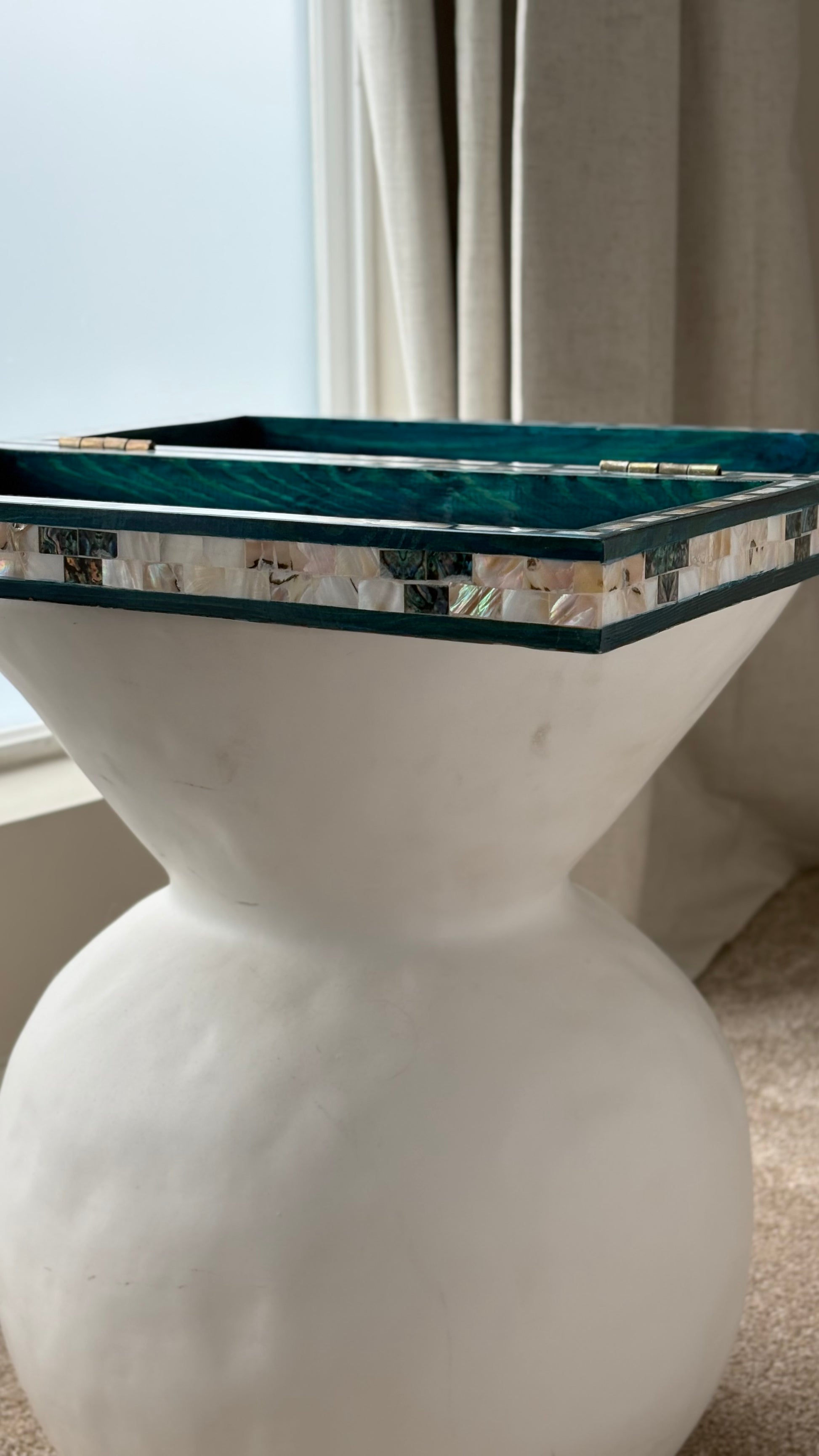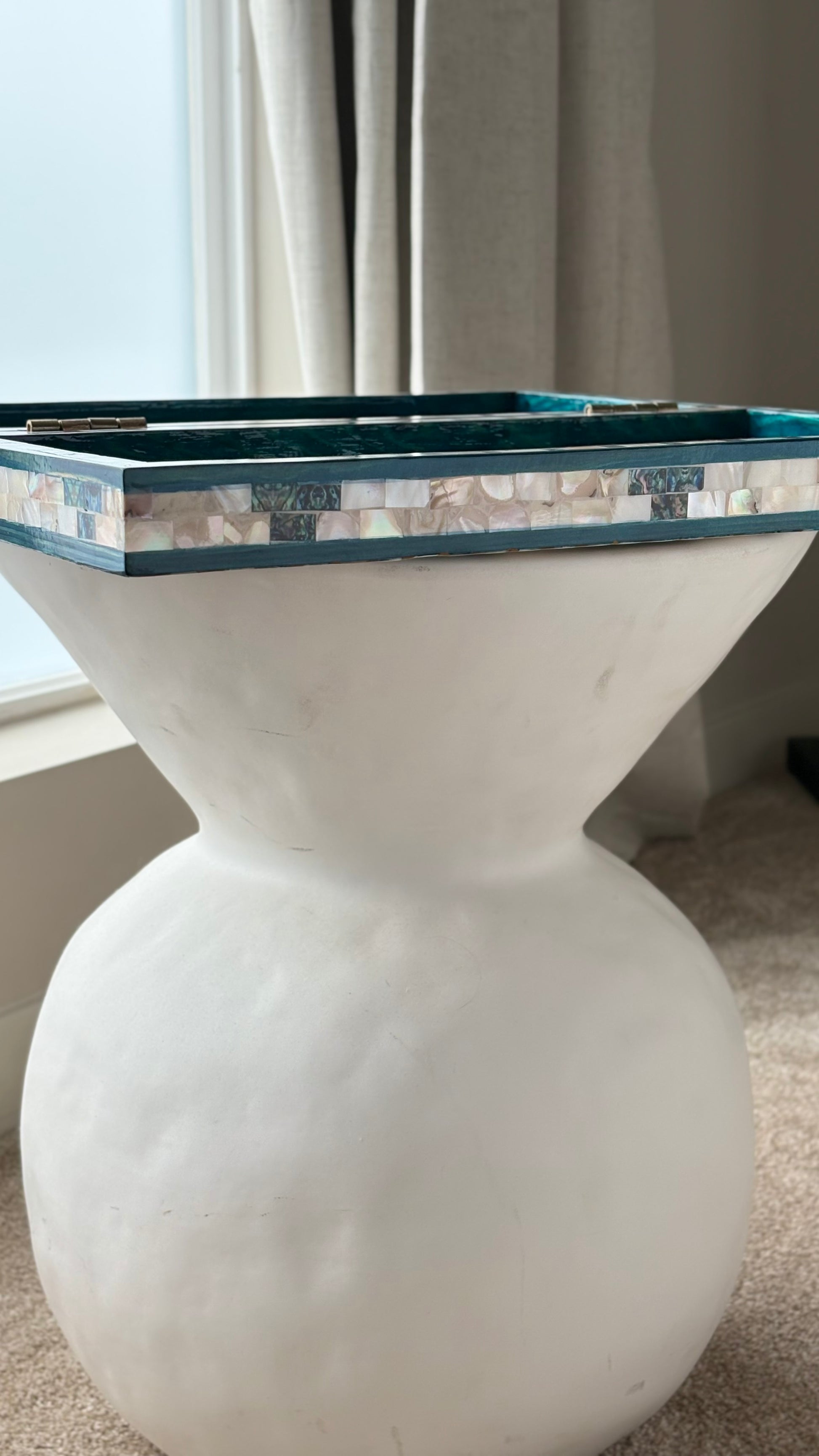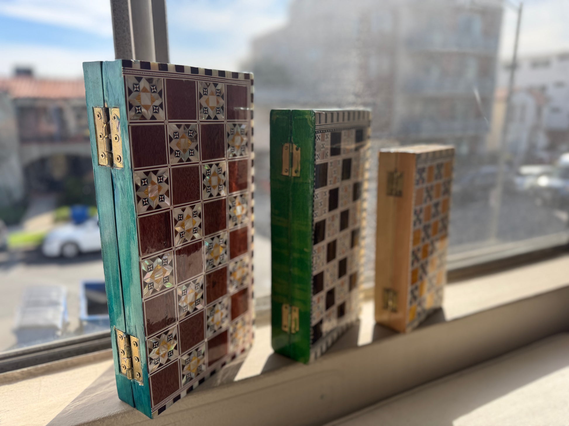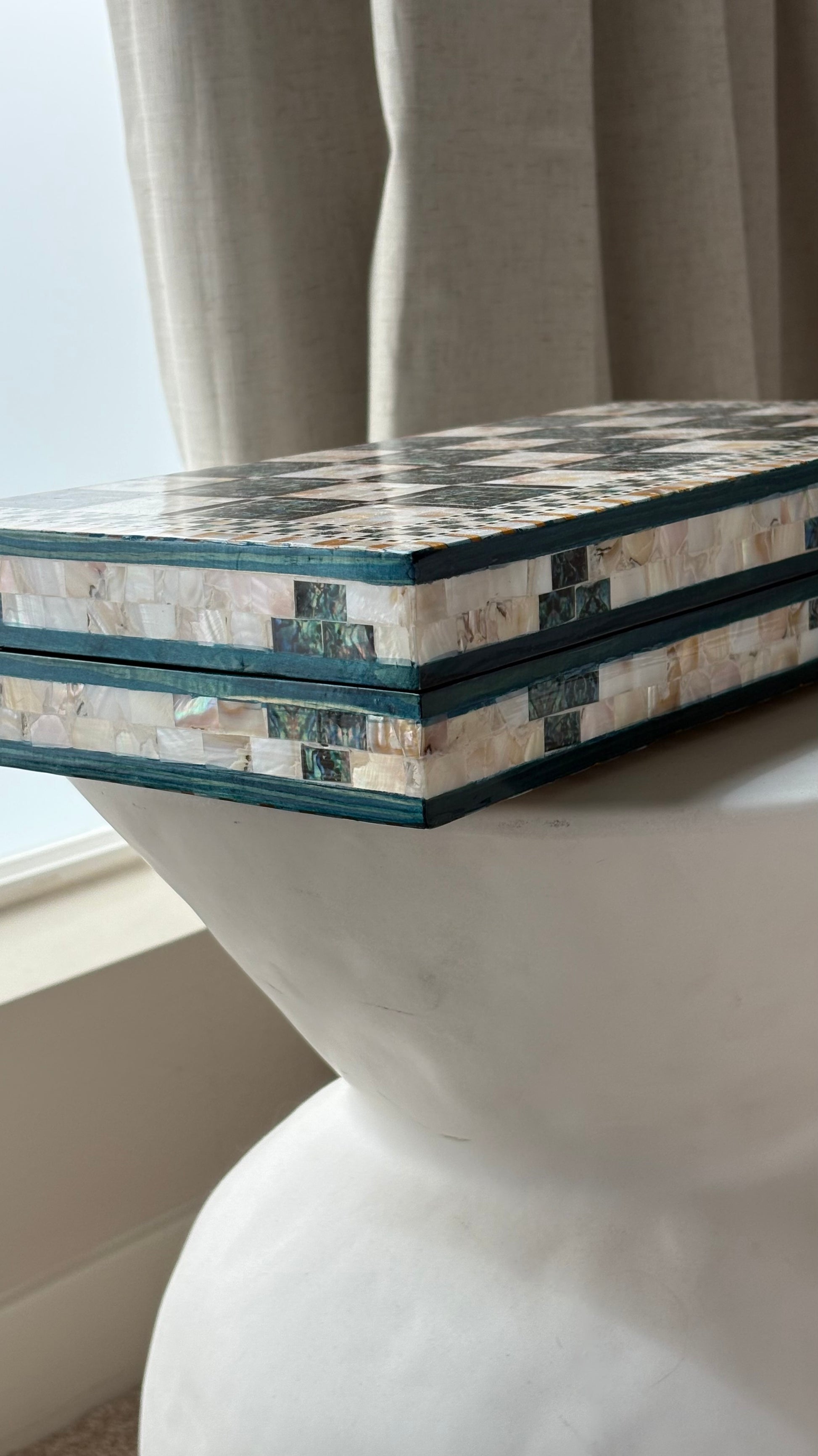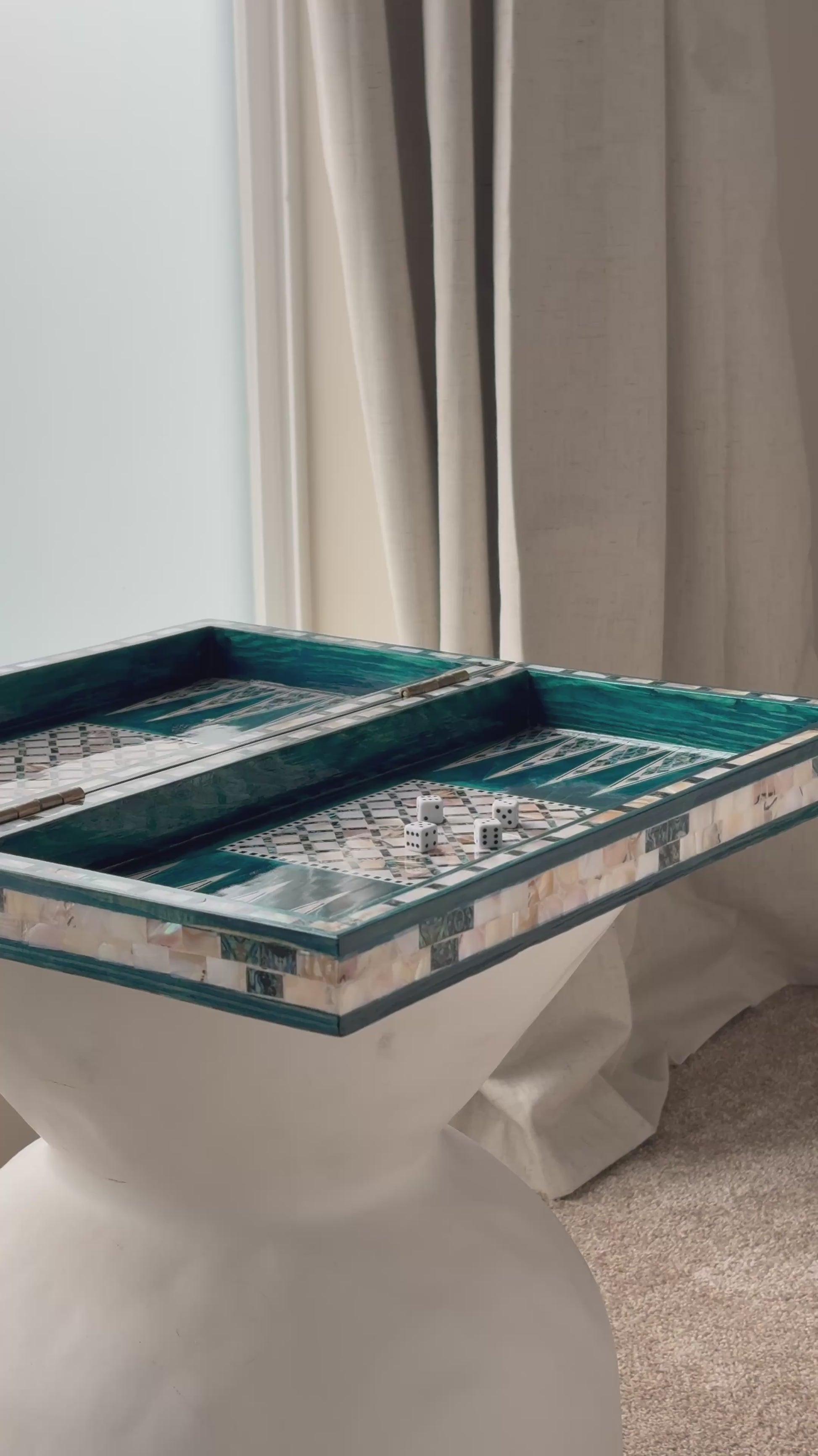 Handmade backgammon and checkers board with vibrant turquoise mother-of-pearl mosaic inlay. Features honeycomb-patterned centerpieces and geometric playing field. Complete with dice. The striking turquoise color evokes Mediterranean seas and coastal elegance - absolutely stunning! This would be a showstopper in any game room, office or living space.